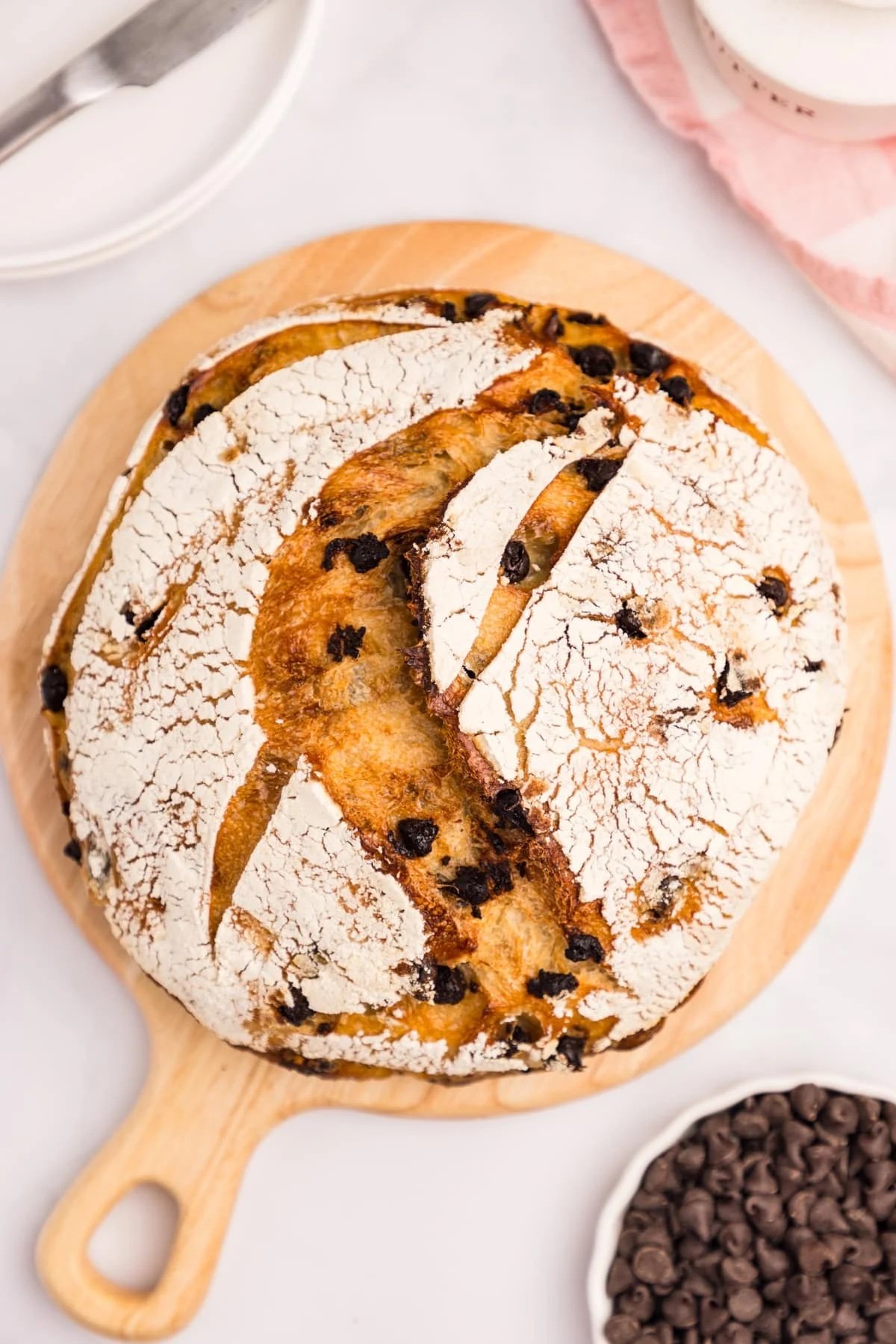 Rustic Sourdough made right here on the farm. Long fermented for the perfect sour taste. Crusty on the outside with the perfect crumb inside with added semi-sweet chocolate chips for the perfect sweet treat.